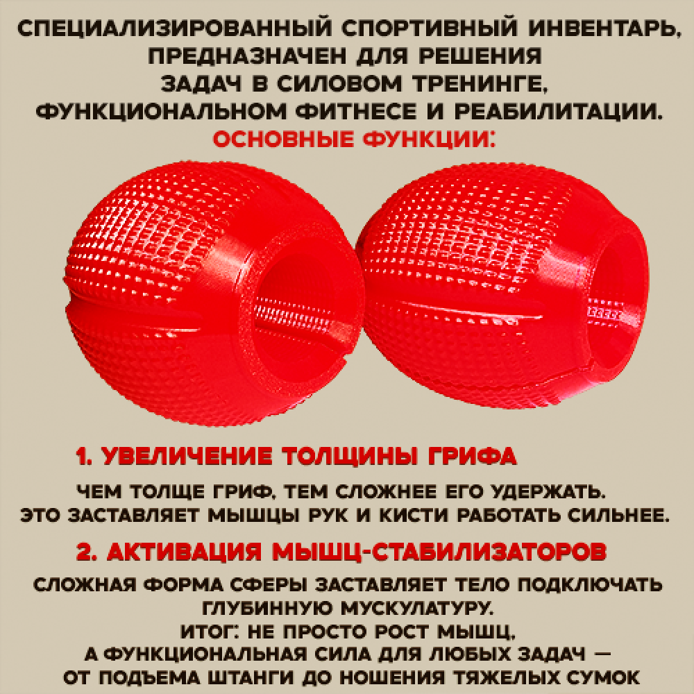 1. Увеличение силы хвата: Сферическая форма позволяет удерживать рабочий вес дольше, что ведет к прогрессу в базовых упражнениях.