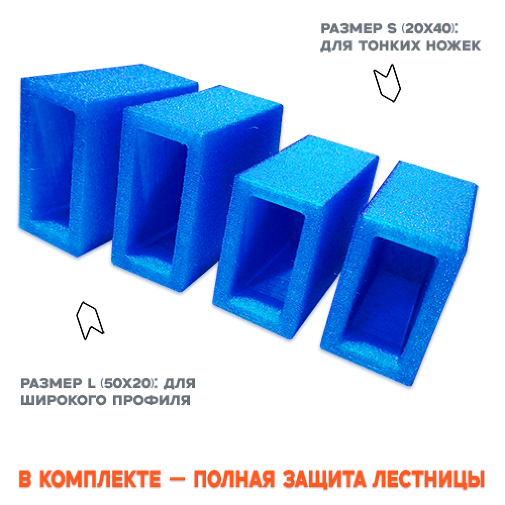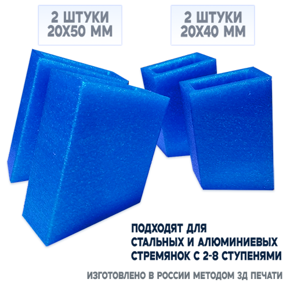 ✅ Универсальный размерный ряд: В комплекте 4 накладки: 2 башмака 50х20 мм и 2 башмака 40х20 мм. Такой набор подходит для большинства типоразмеров профиля (2-х, 3-х, 4-х и 5-ти ступенчатых стремянок) от разных производителей.